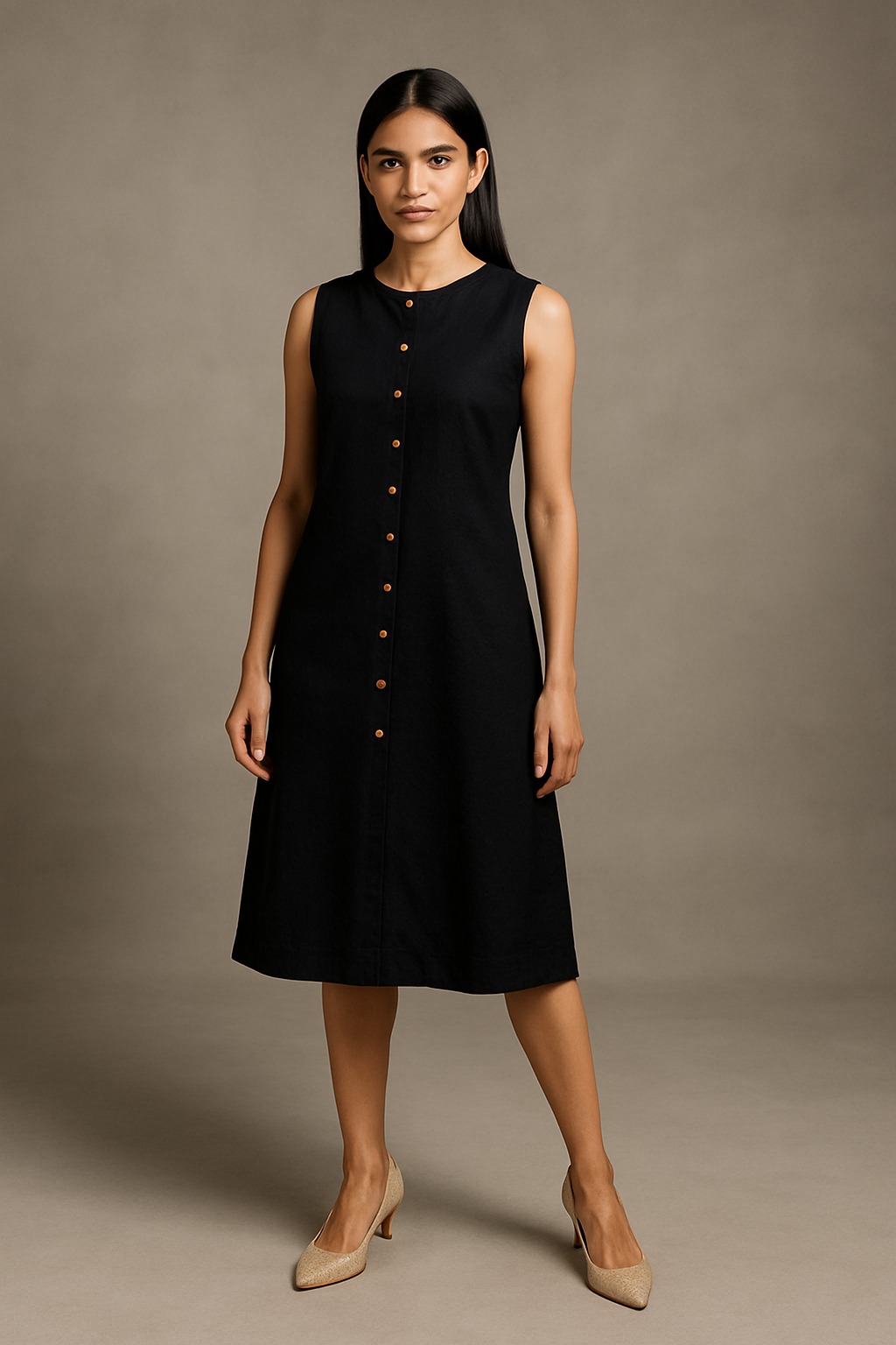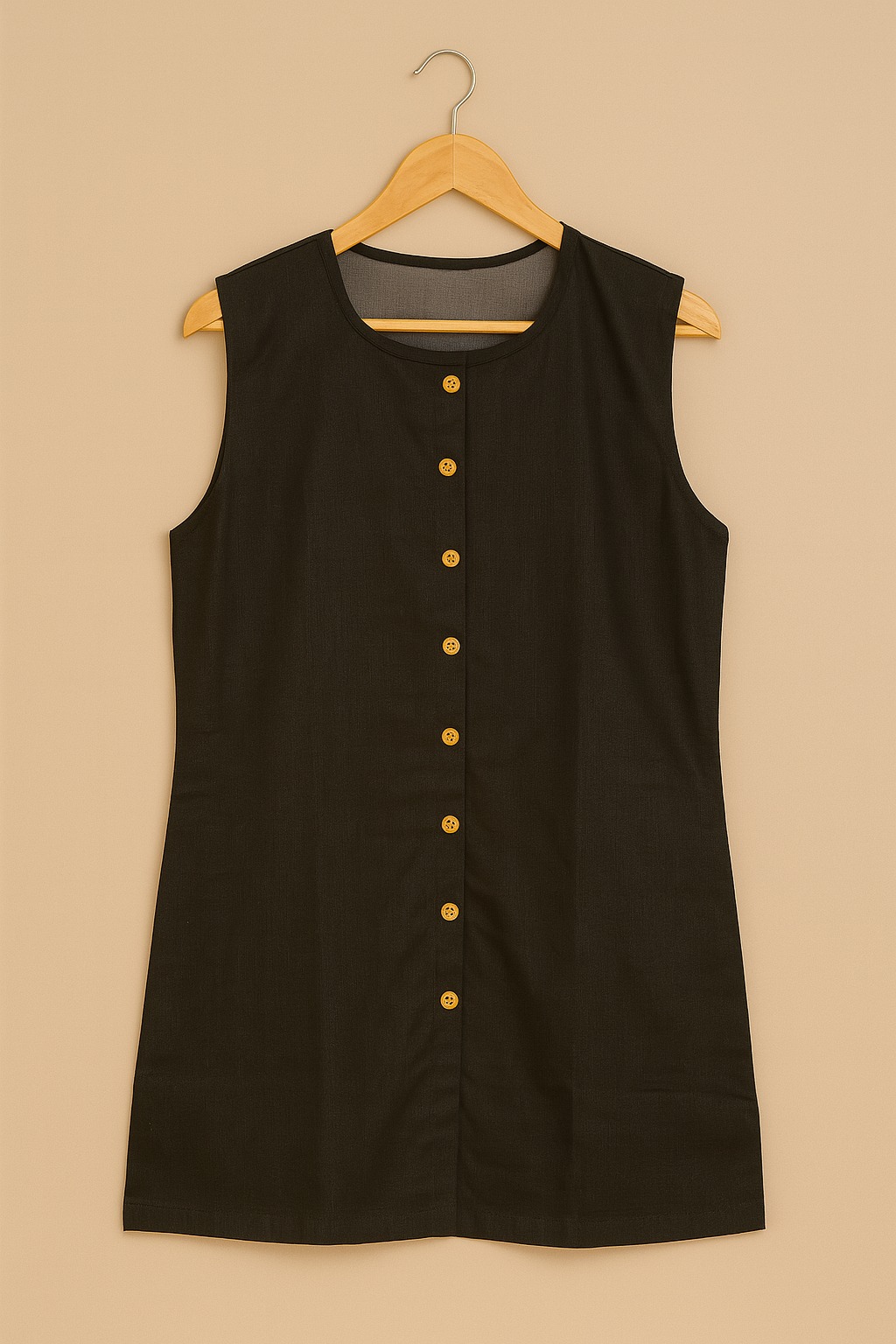 A sleek, sleeveless tunic designed for effortless everyday elegance. Featuring a round neckline and a front placket with contrasting wooden-style buttons, this tunic brings together simplicity and sophistication. The straight silhouette makes it versatile for layering or standalone wear.