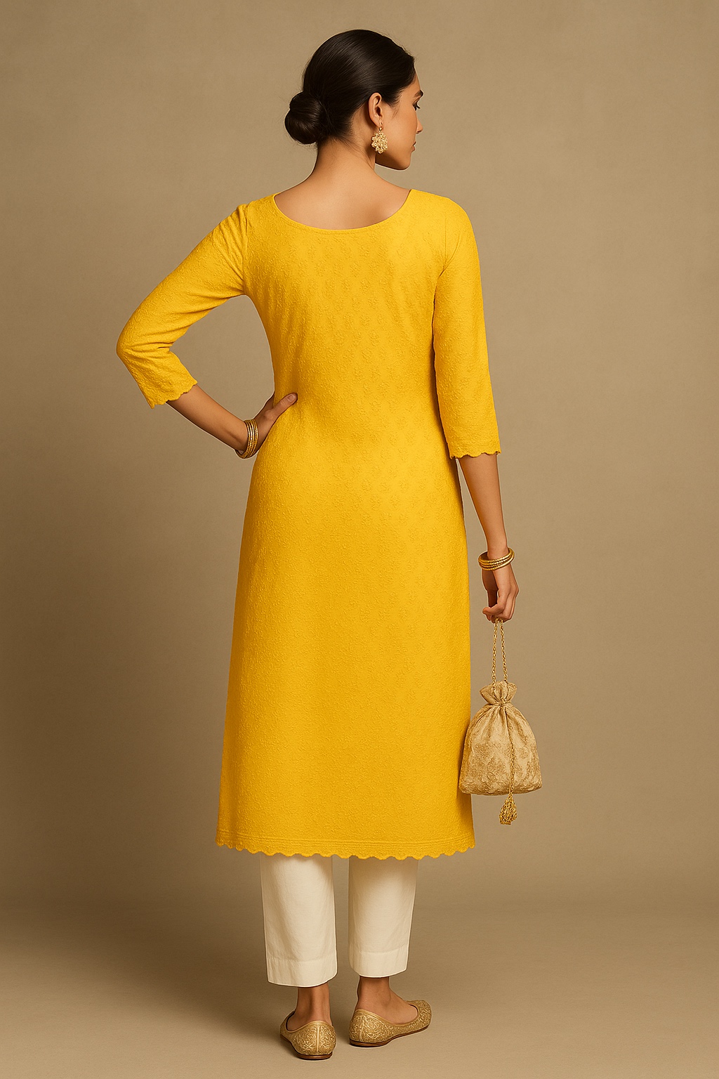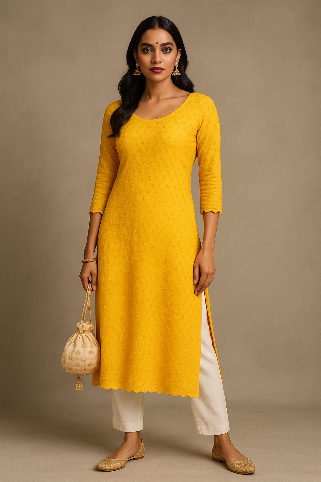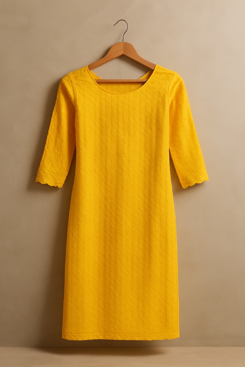 This mustard yellow kurti blends festive elegance with everyday sophistication, featuring minimal embroidery texture and a clean, straight silhouette. Finished with a scalloped hem and 3/4 sleeves, it’s perfect for ethnic gatherings and smart daytime wear.