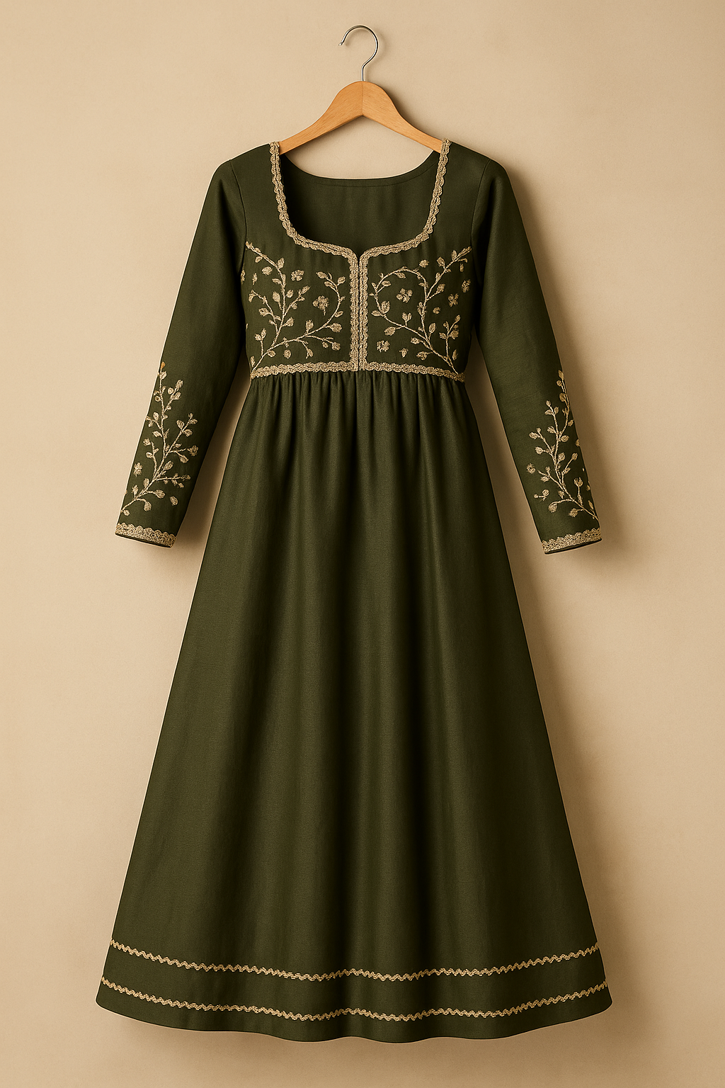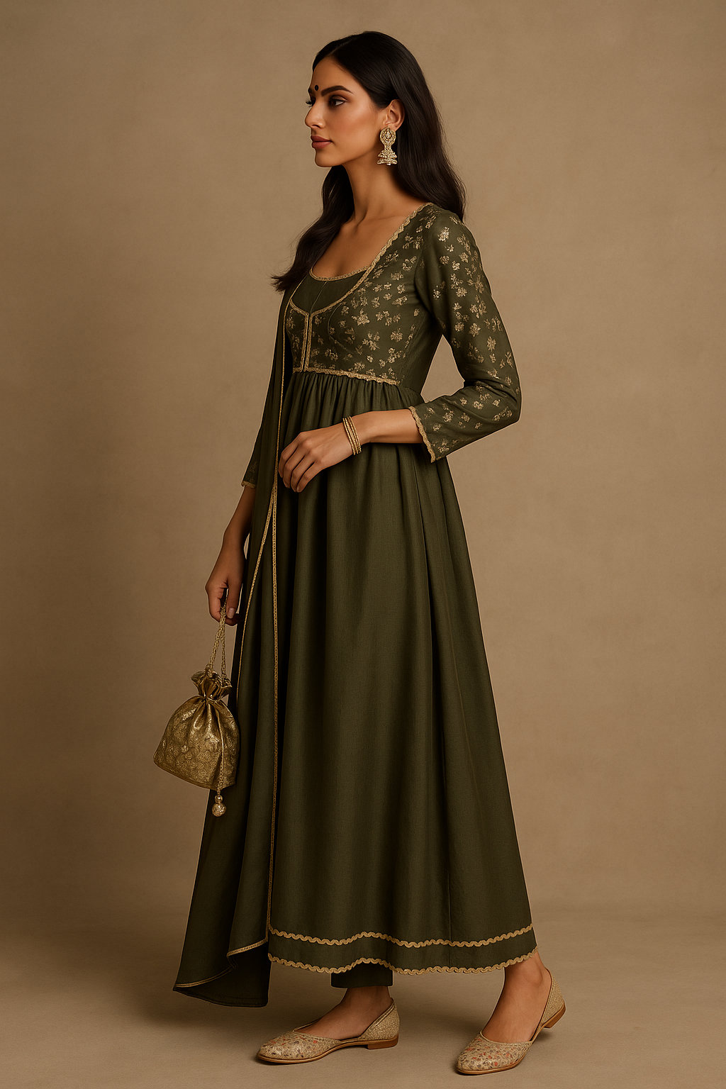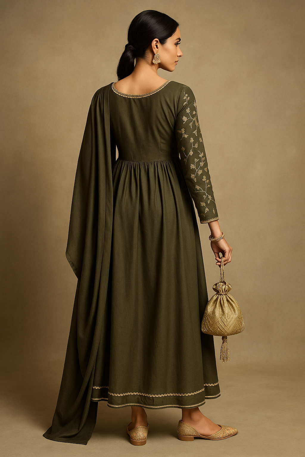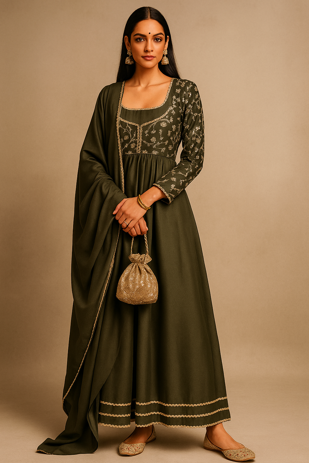 A luxurious full-length olive green Anarkali suit adorned with intricate floral embroidery, paired with a matching flowing dupatta and embellished potli bag. Perfectly crafted for a graceful, regal look.