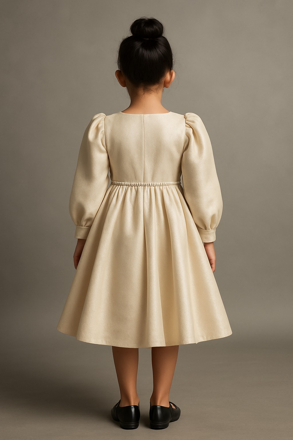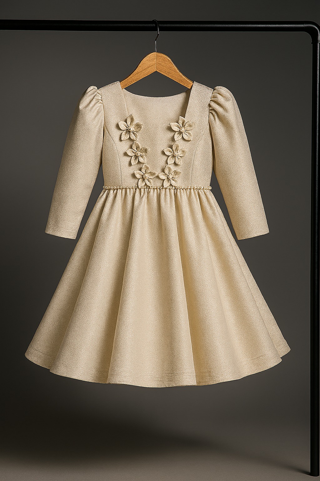 A charming knee-length dress designed for little girls, featuring puffed full sleeves and a gracefully flared skirt. The bodice is adorned with delicate 3D floral embellishments that add a whimsical elegance. Completed with a pearl headband for a graceful and polished look.