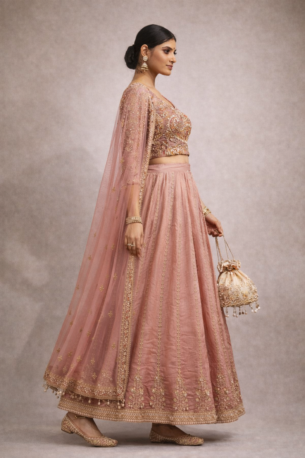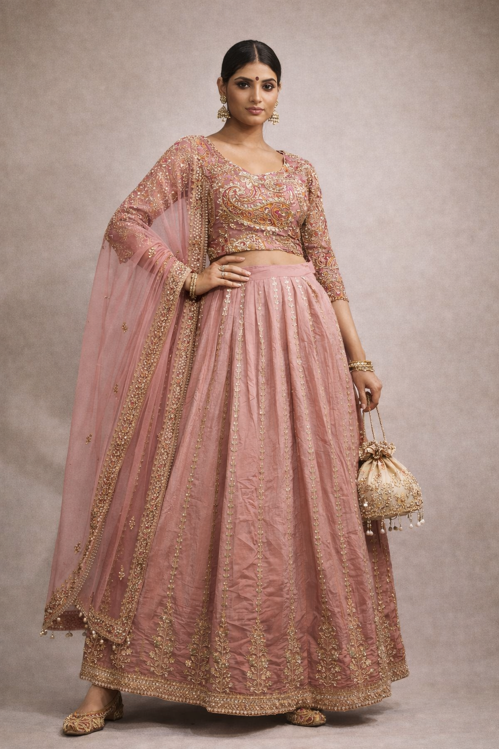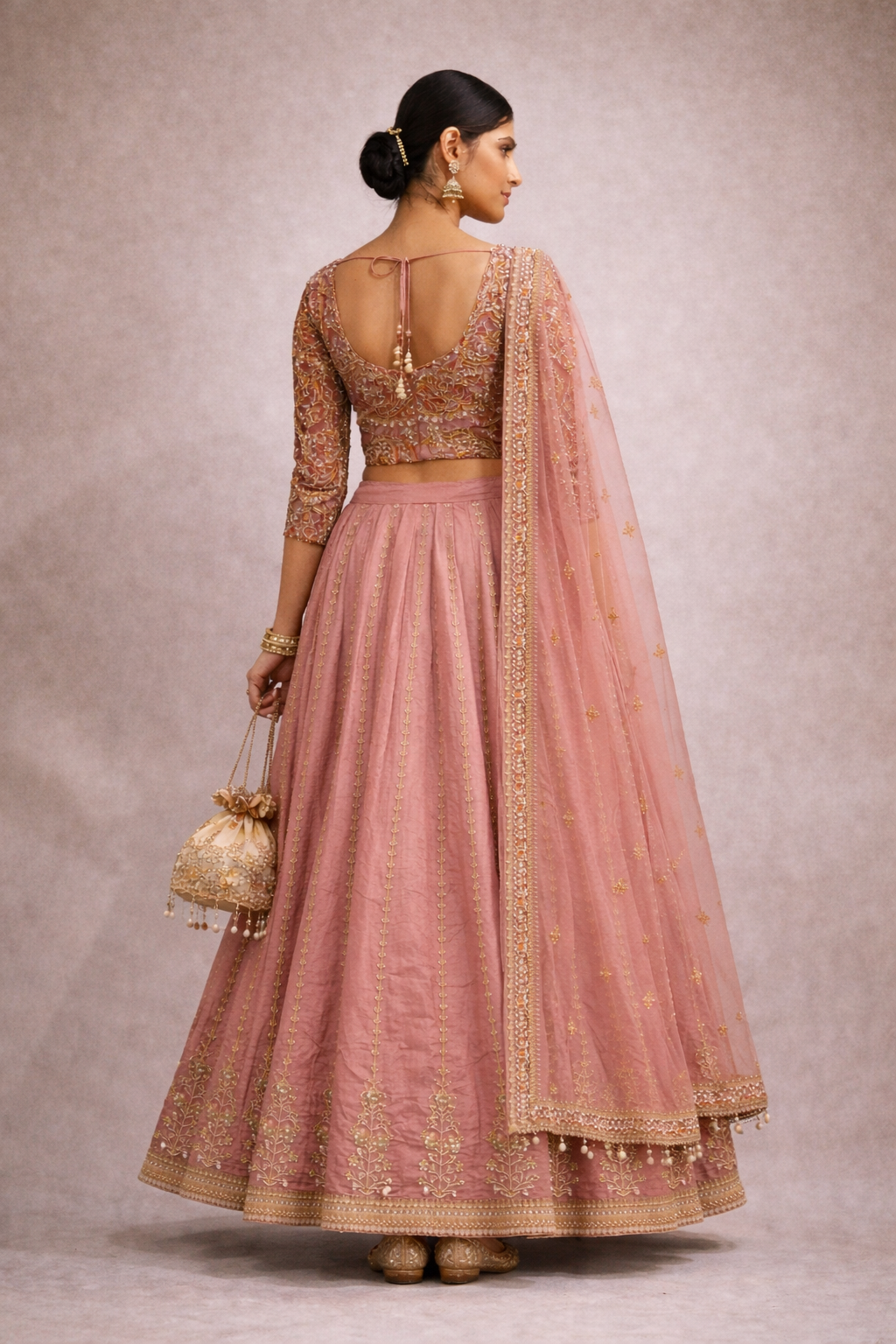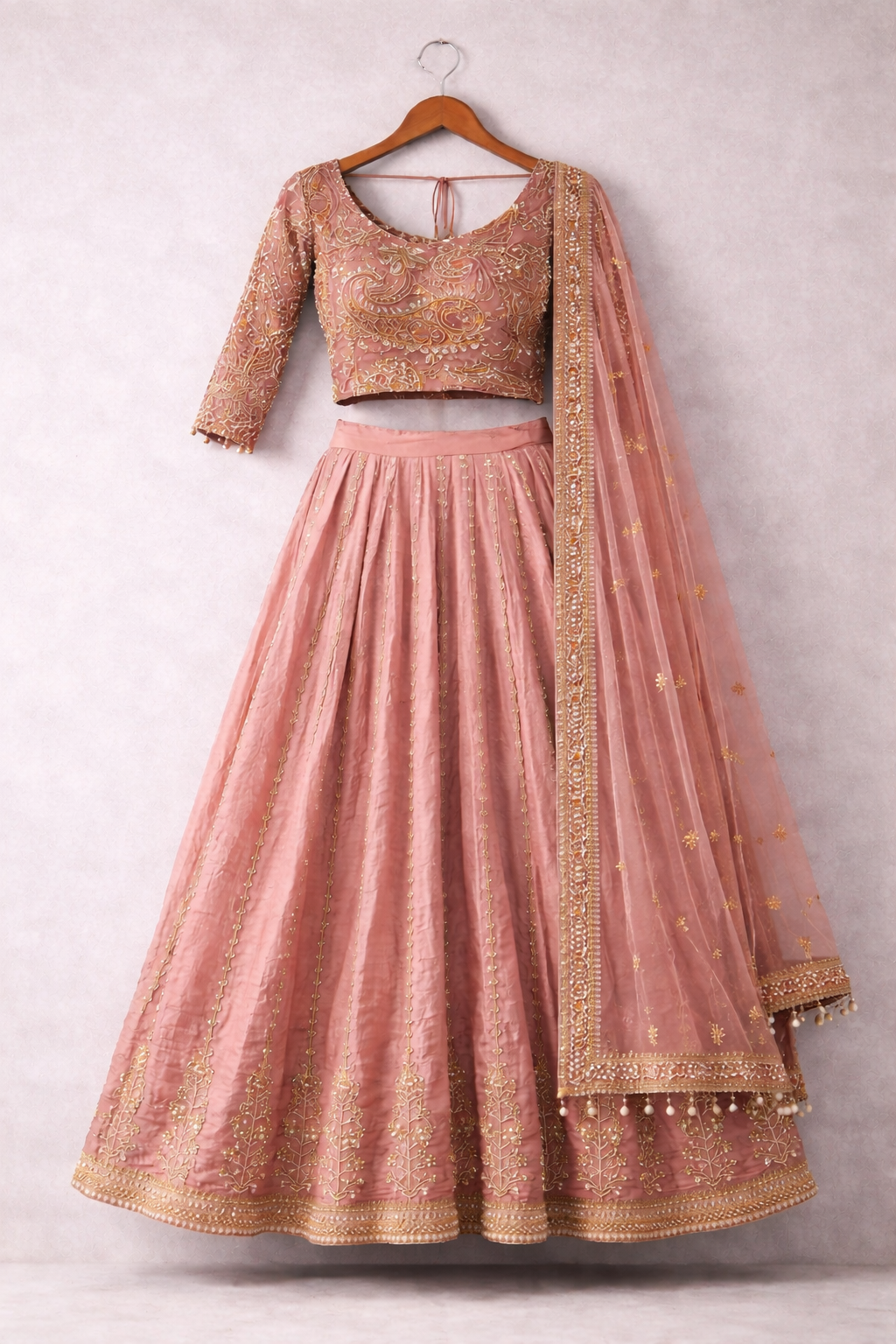 A timeless dusty-rose lehenga set crafted to celebrate Indian craftsmanship with a modern, refined silhouette. Featuring a richly embroidered blouse with a graceful deep-back tie detail, a flared lehenga adorned with delicate gold motifs, and a sheer embroidered dupatta, this ensemble blends heritage elegance with contemporary luxury—perfect for statement occasions.