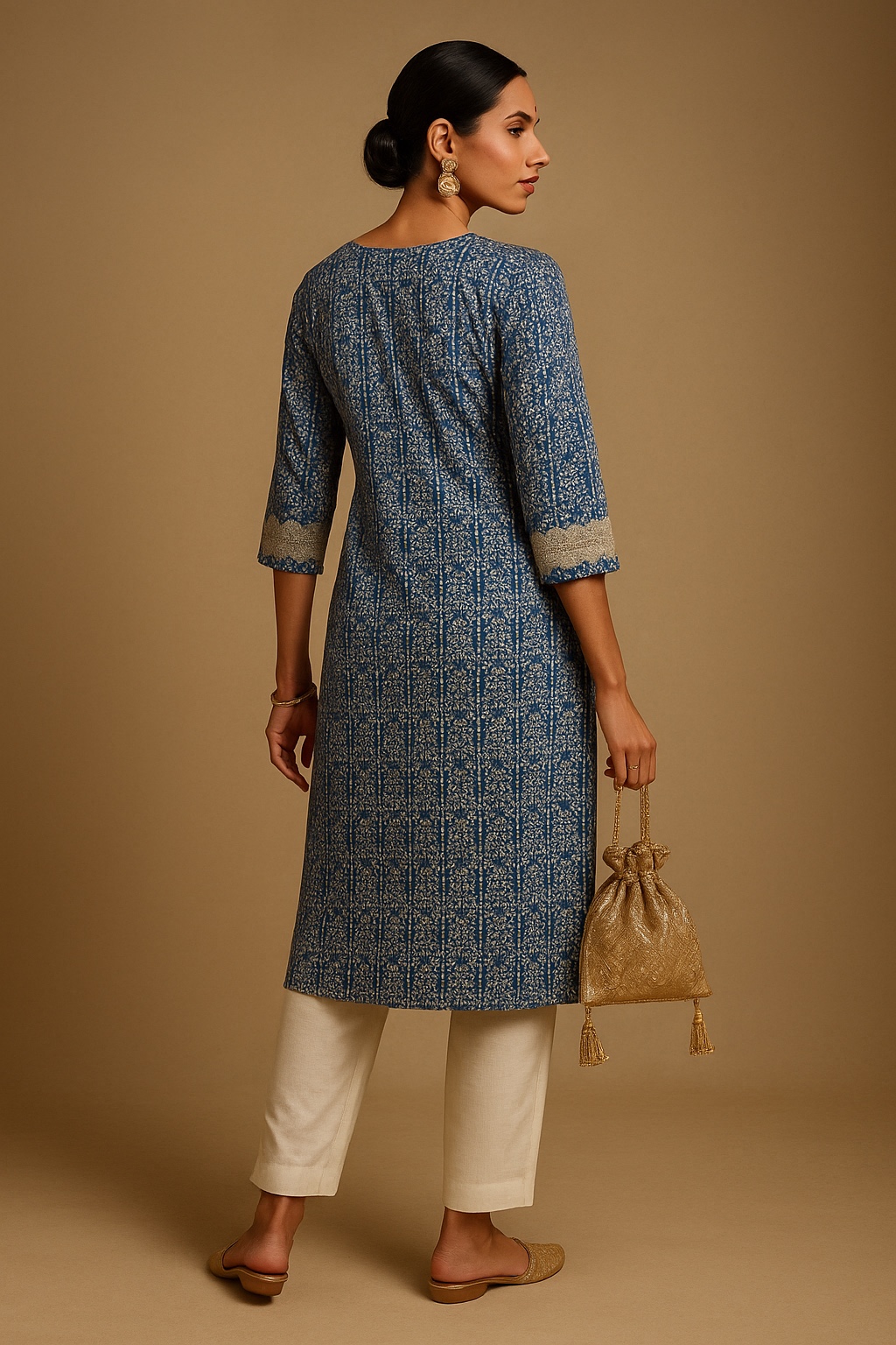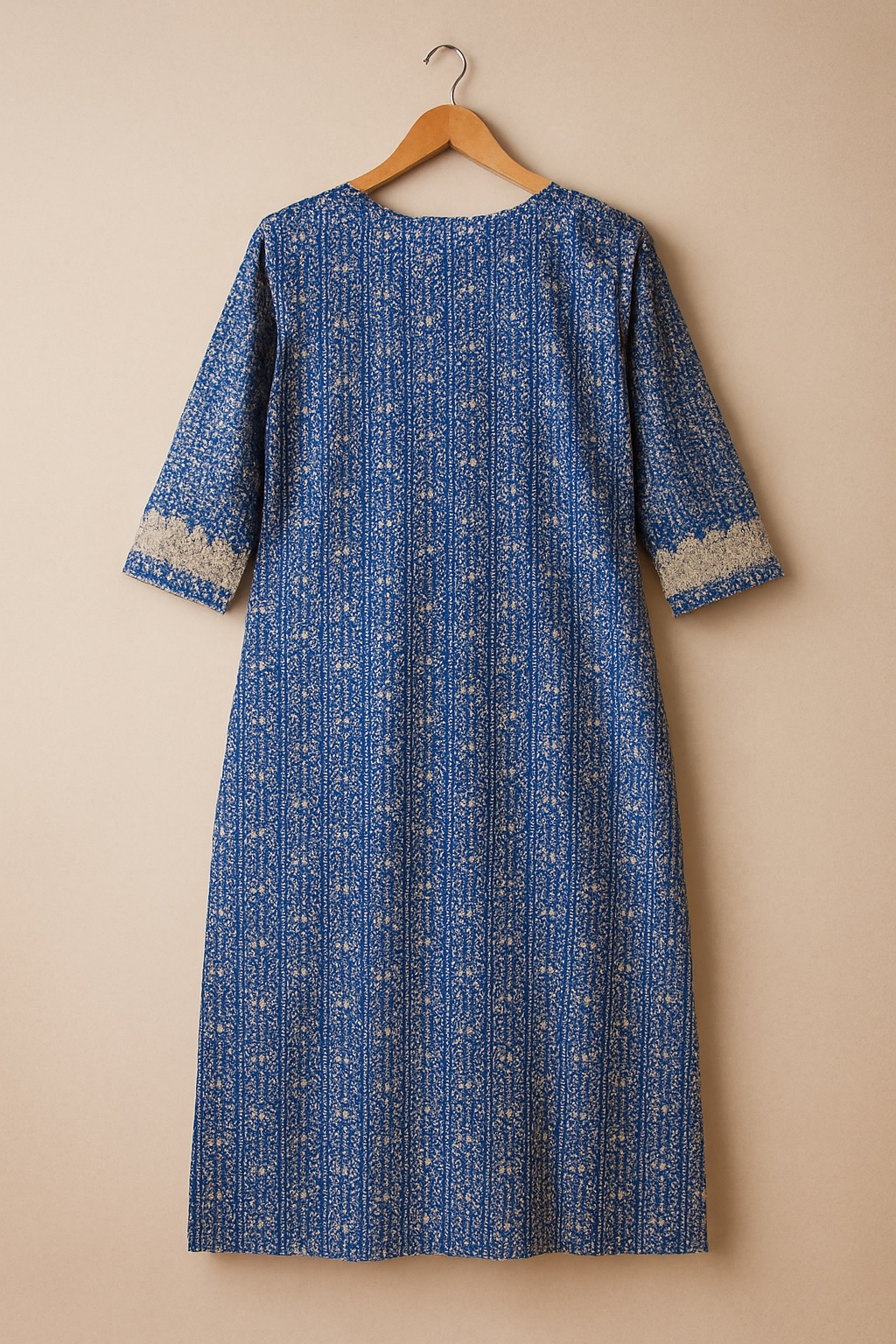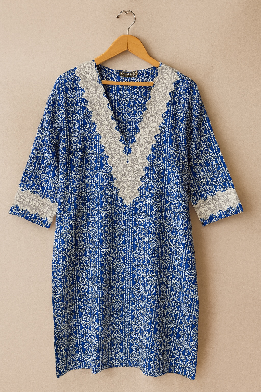 A vibrant and elegant royal blue kurti featuring an intricate ethnic print throughout, beautifully enhanced with a contrasting scalloped white yoke panel and sleeve accents. A perfect blend of tradition and ease for everyday elegance.