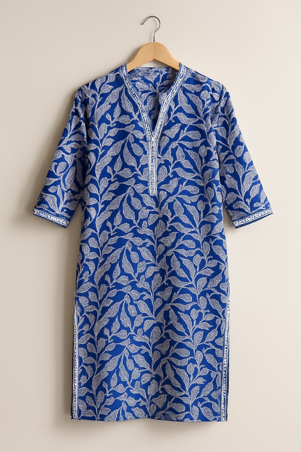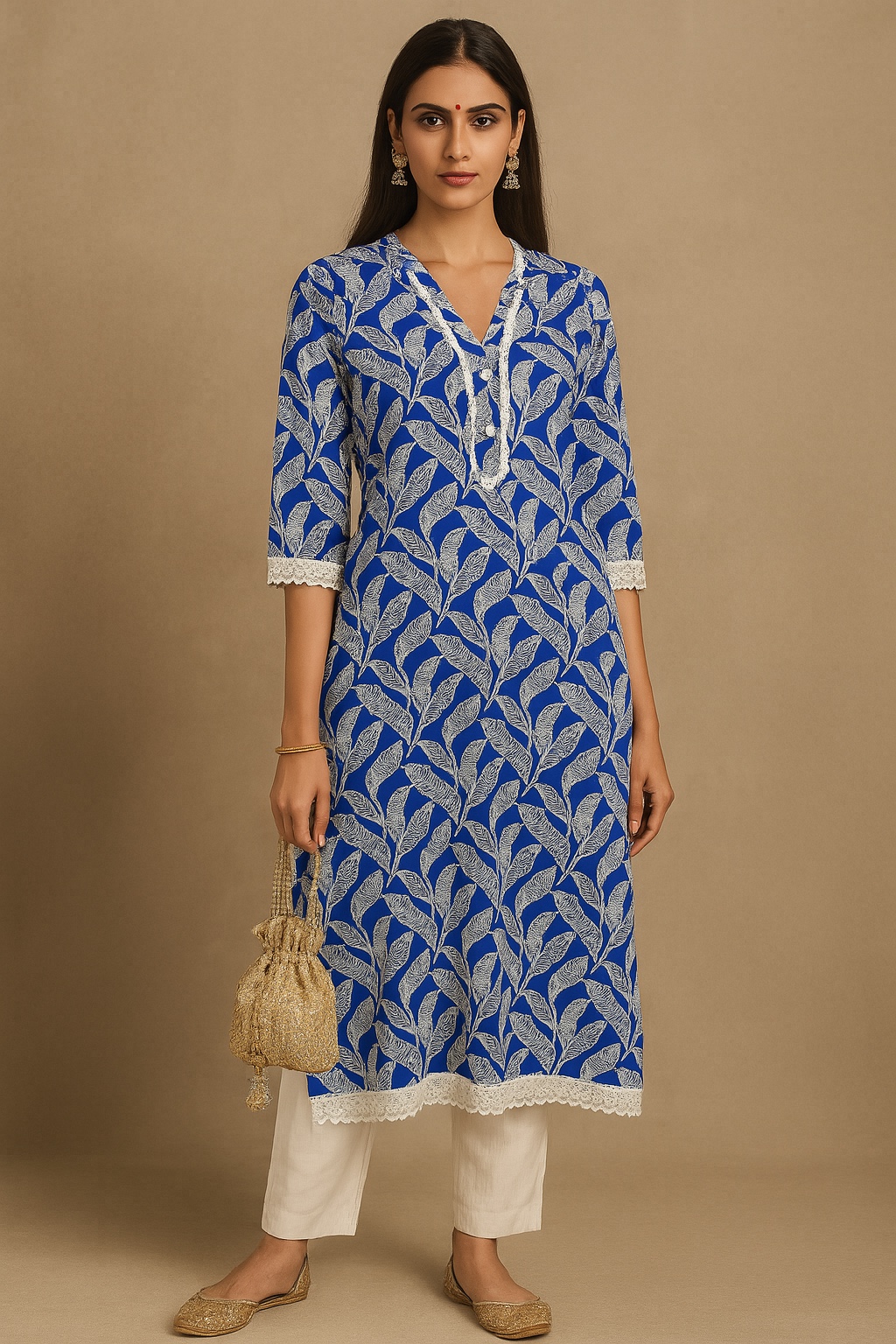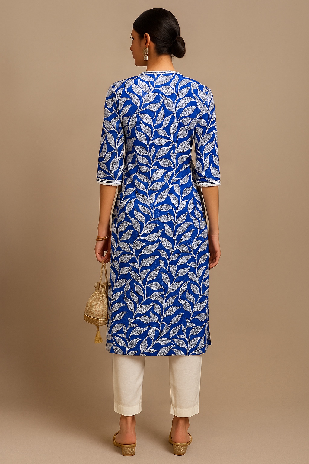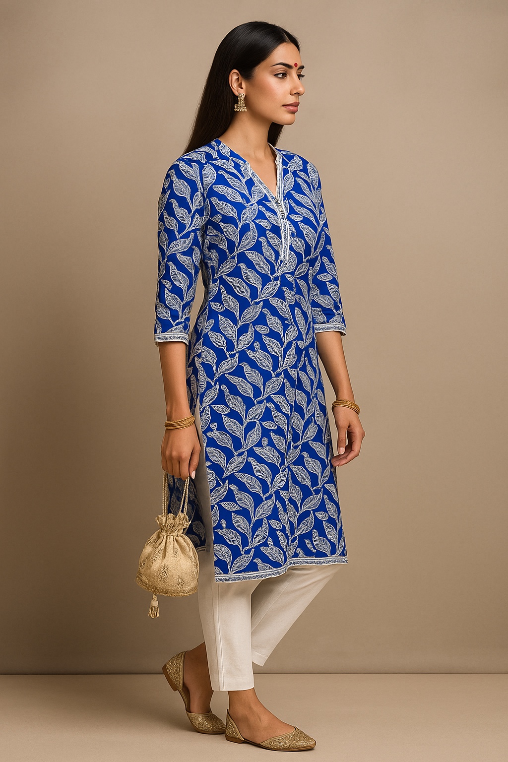 AÂ striking royal blue kurti adorned with intricate white leaf motifs, perfect for daywear or casual ethnic styling. Featuring classic side slits and minimal embroidery around the neckline and sleeves for a clean, refined look.