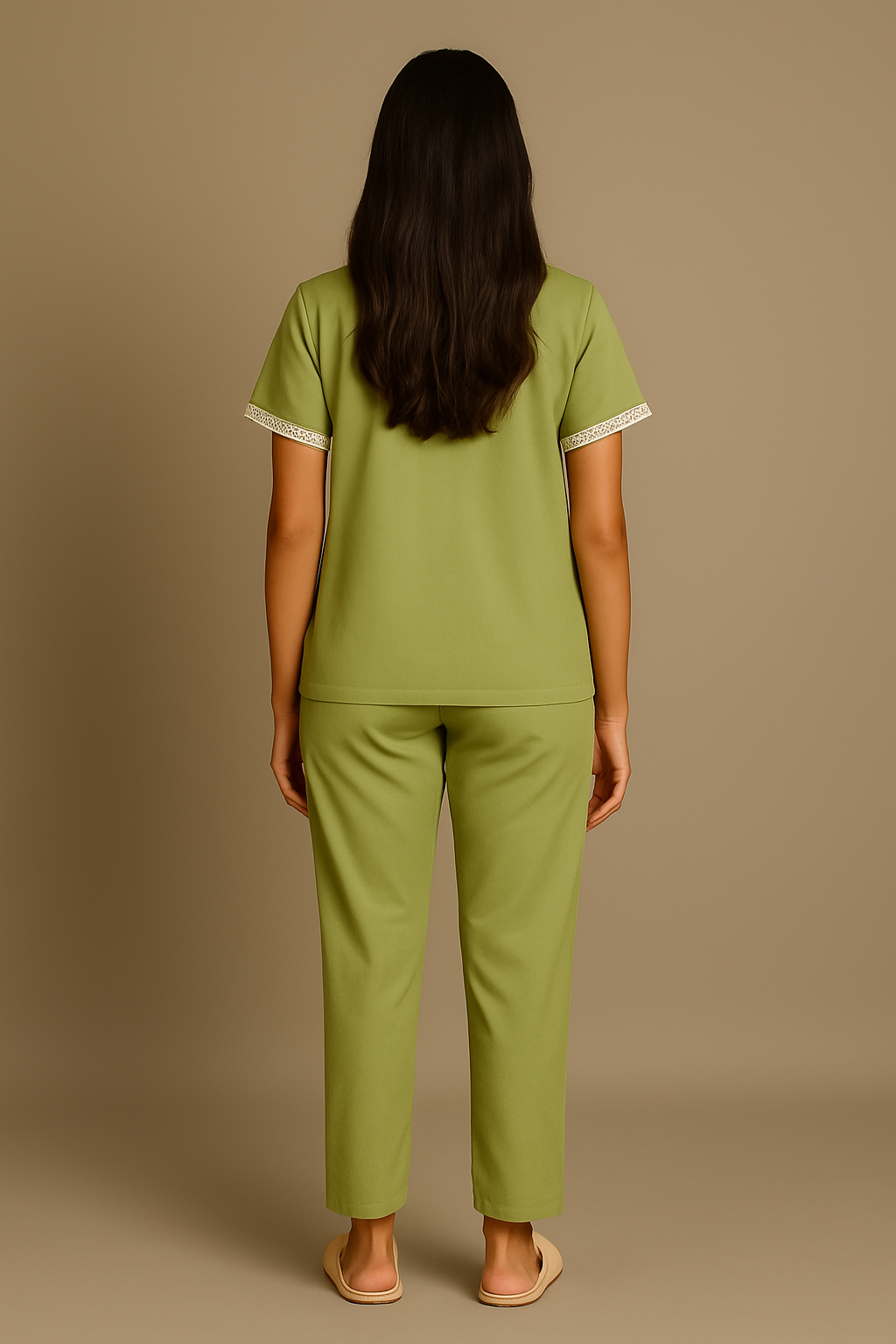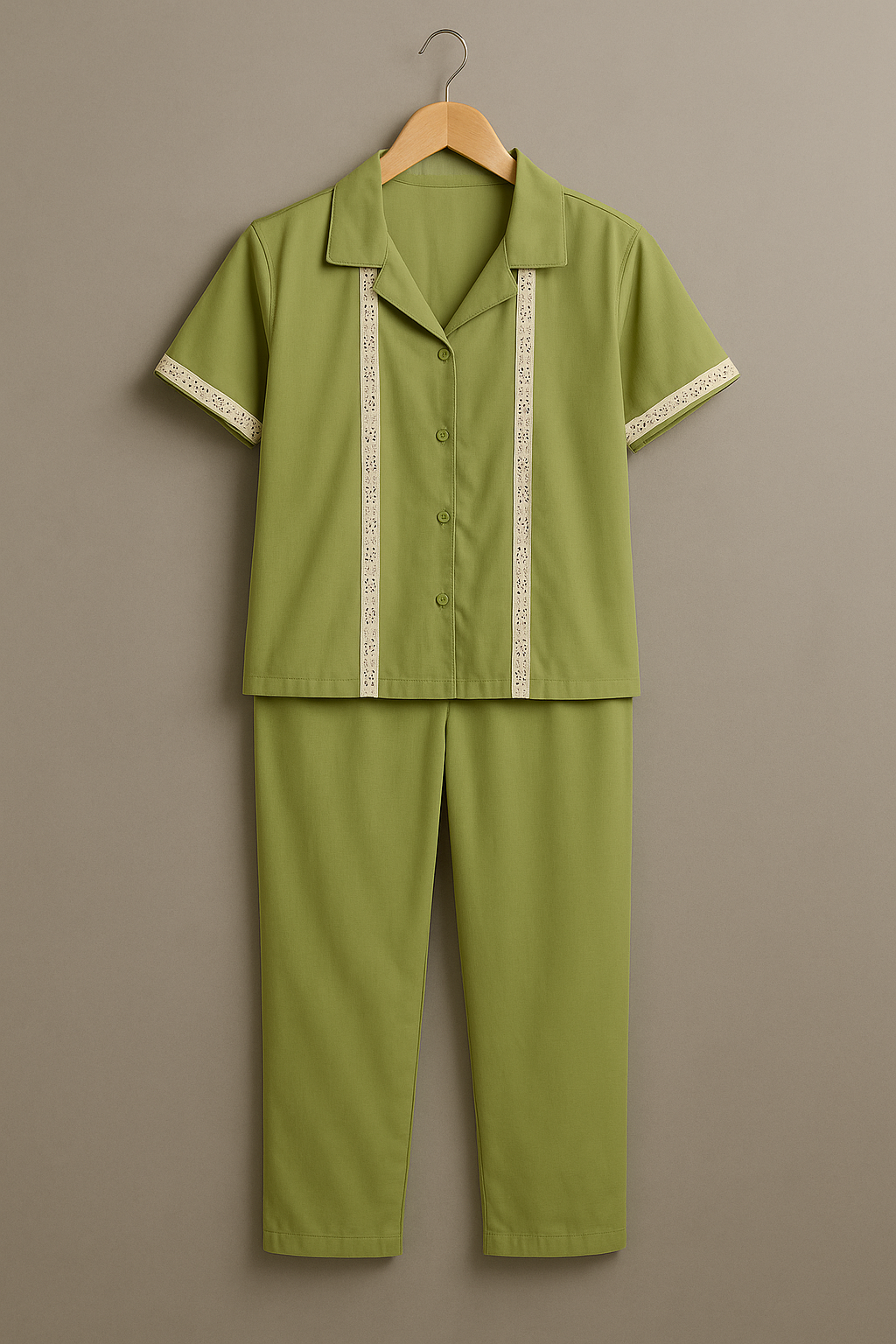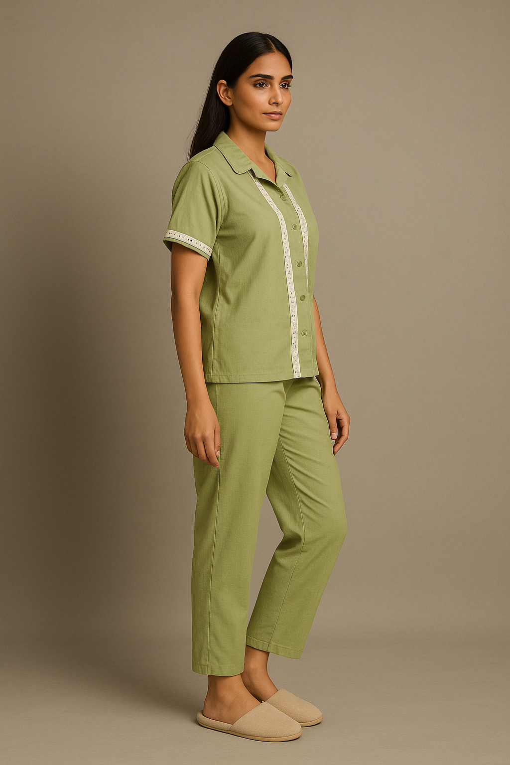 Two-piece sage green nightwear set featuring a collared button-down shirt with lace detailing and matching straight-fit trousers.