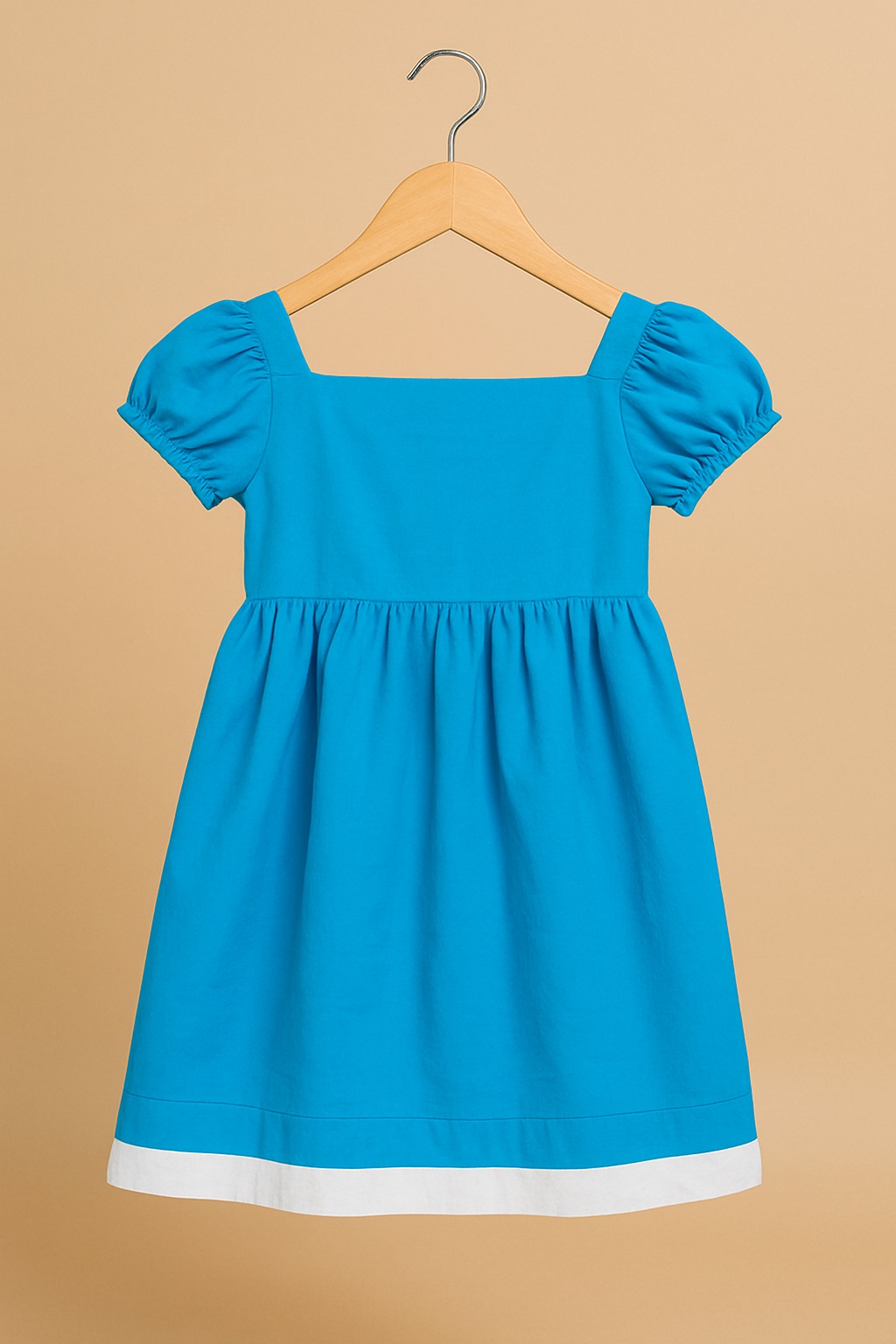 A vibrant blue midi dress for girls featuring puffed short sleeves and a square neckline. The dress is accented with a crisp white hem border, adding a charming contrast to the playful and cheerful look.