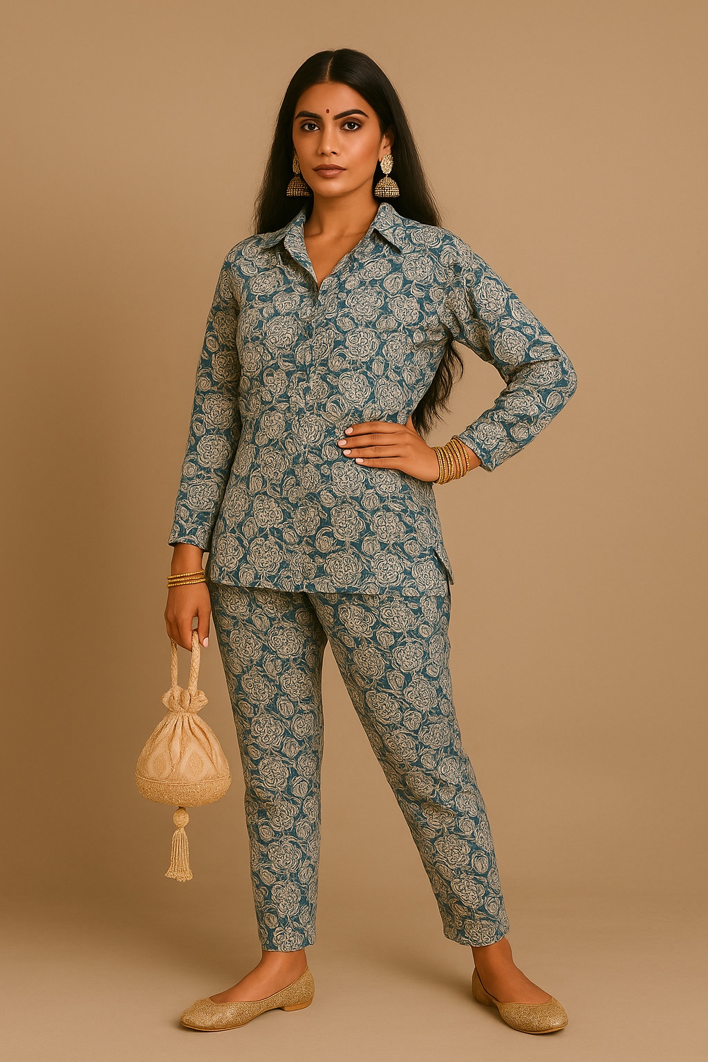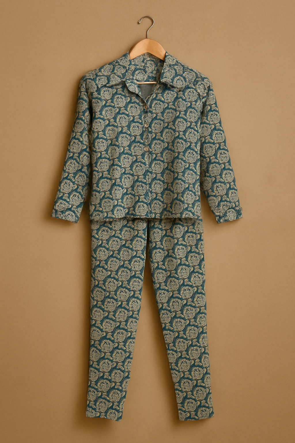 A comfortable and stylish co-ord set for boys featuring a collared full-sleeve shirt and matching straight-fit trousers. The set is adorned with a traditional floral block print in beige over a teal base, offering a fusion of ethnic charm and modern silhouette. Perfect for festive occasions and family functions.