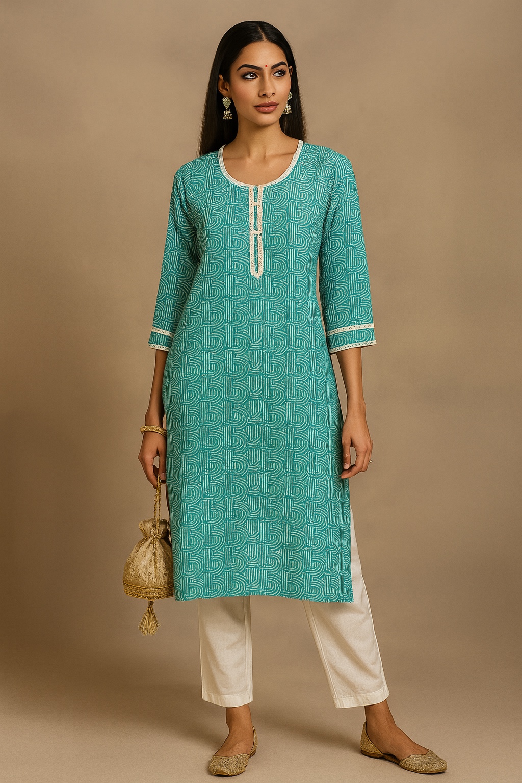 AÂ modern twist to ethnic casuals, this teal green kurti features a structured geometric print in white with a simple round neckline and contrast detailing. A versatile wardrobe staple ideal for everyday wear.