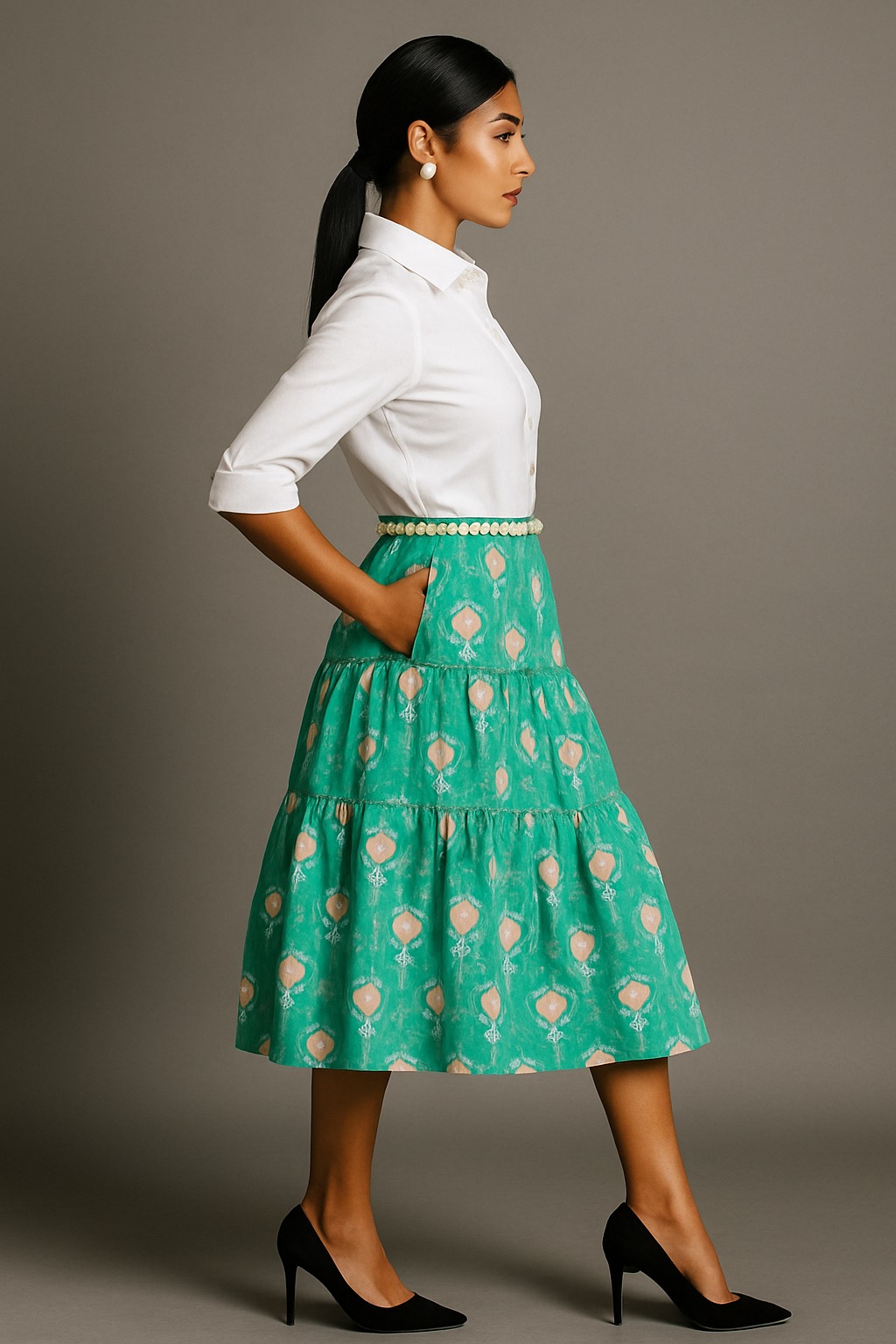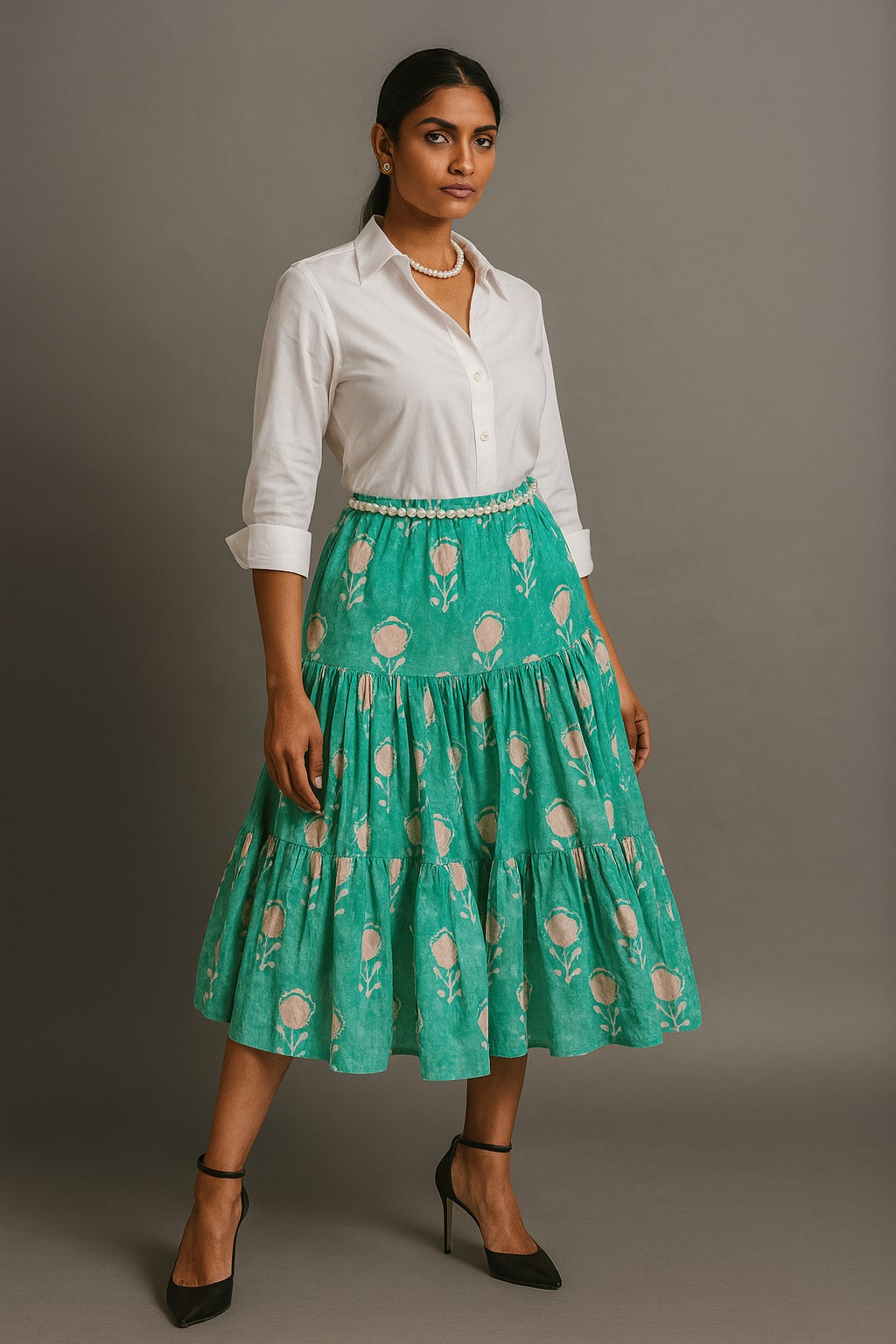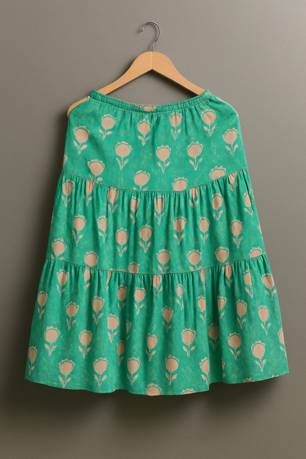 A breezy and vibrant flared skirt featuring a three-tiered silhouette and all-over handblock floral print. The skirt offers a gathered design for added volume and a comfortable elasticated waistband for easy wear. Ideal for casual and semi-casual occasions, this skirt effortlessly blends traditional motifs with a modern, relaxed fit.