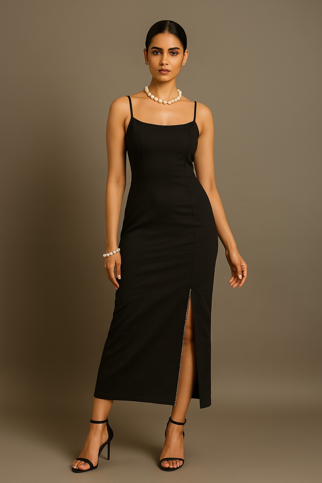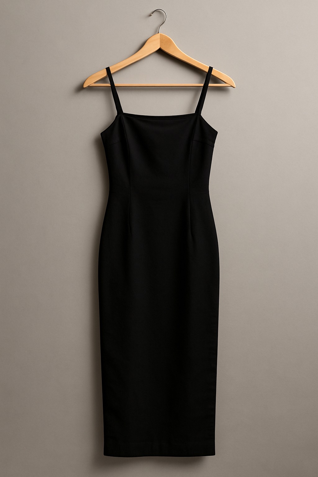 A sleek and sophisticated black midi lycra fabric dress designed with a flattering bodycon silhouette and thin shoulder straps. The minimalist cut enhances your natural curves, making it a perfect go-to for elegant evenings or chic events. This wardrobe essential embodies timeless style and modern elegance.