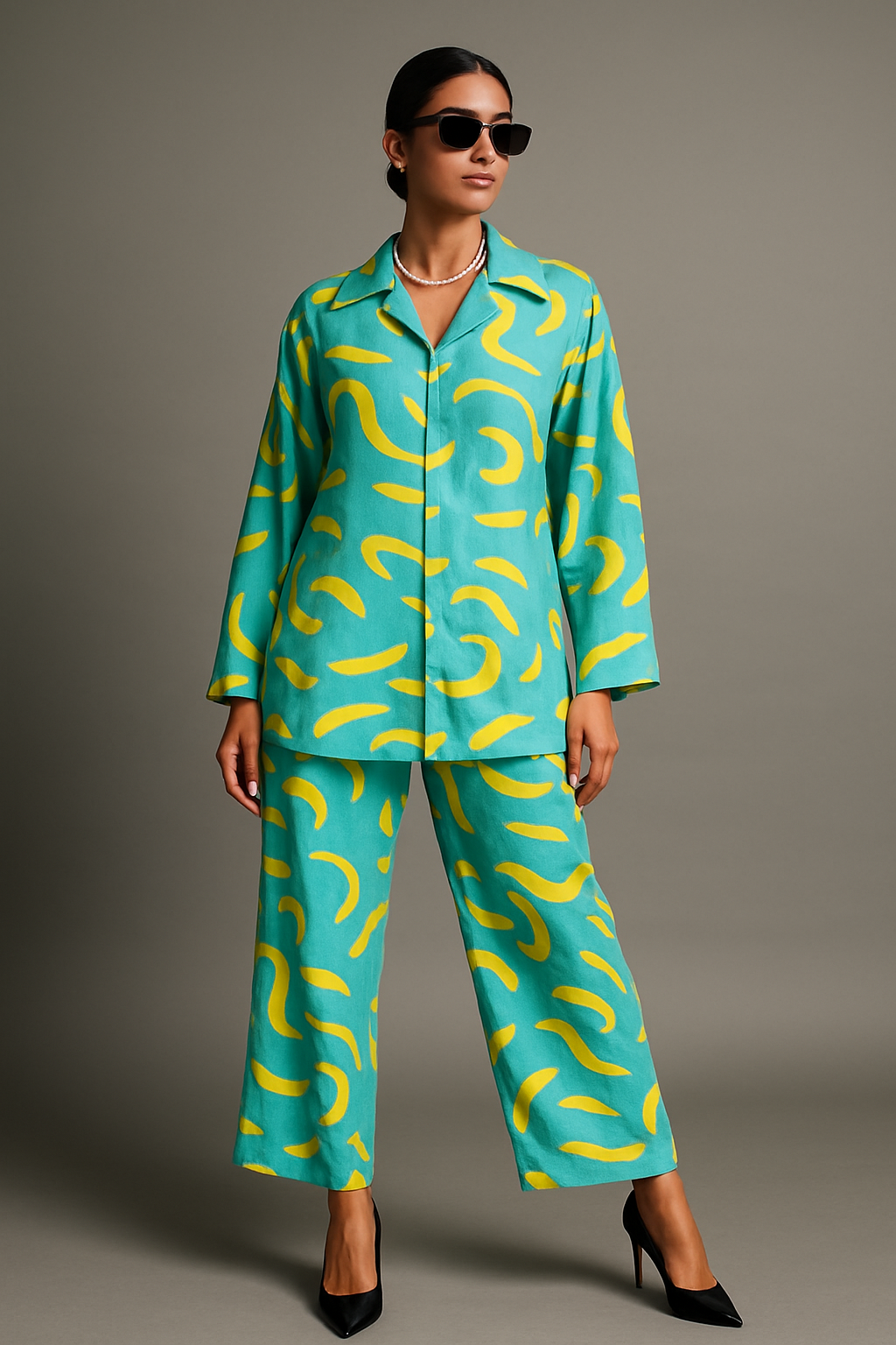 A vibrant two-piece co-ord set featuring a button-down shirt and straight-fit trousers in a bold turquoise base with abstract yellow patterns. Perfectly designed for effortless comfort and standout style.